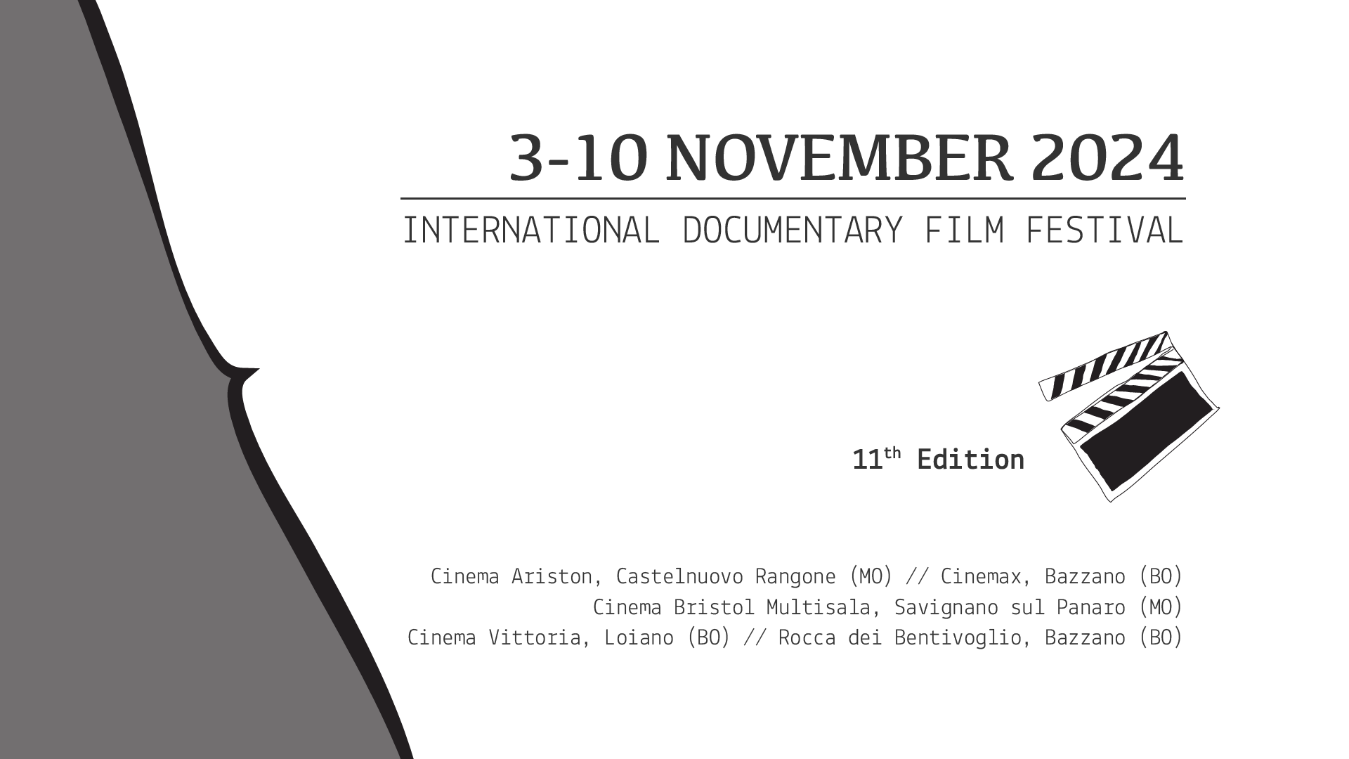 Il festival si terrà dal 3 al 10 novembre nelle province di Bologna e Modena. Più precisamente nei comuni di Valsamoggia e Loiano, Savignano sul Panaro e Castelnuovo Rangone. L’idea alla base è quella di un festival diffuso, ospitato da sale indipendenti e in luoghi solitamente non raggiunti dai soliti festival. Si cerca di rispondere alla sfida di creare comunità attorno alle sale cinematografiche: per portare il cinema fuori dai circuiti festivalieri tradizionali.
