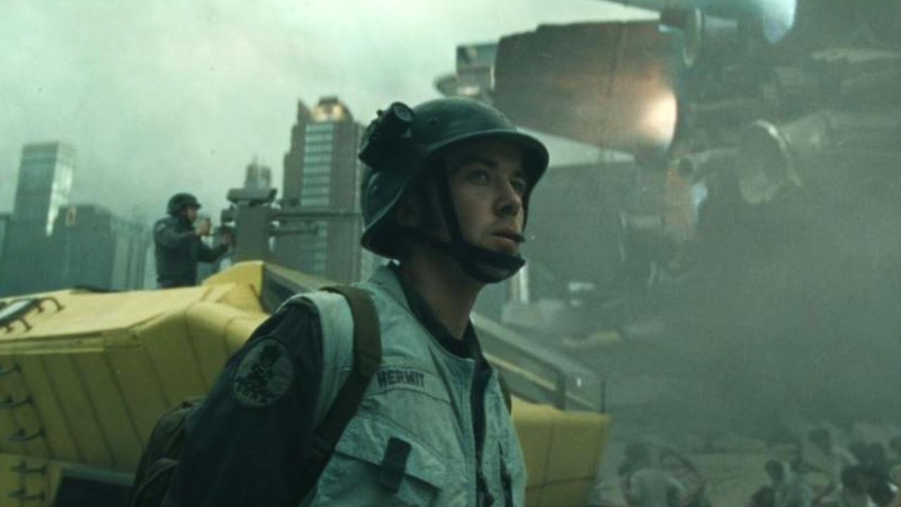 Fotogramma di ‘Alien: Pianeta Terra’ (2025). CJ “Hermit” (Alex Lawther) vestito da soldato medico sullo sfondo della navicella schiantata a terra