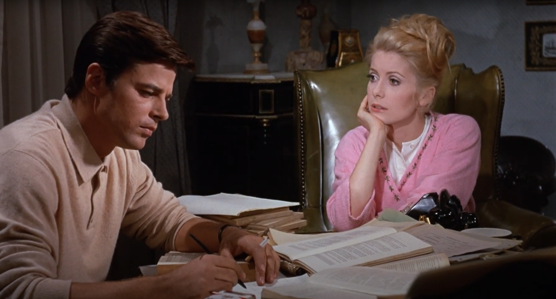 Più che per il messaggio, questa interazione, per quanto labile, è un’altra dimostrazione della distanza che intercorre tra i coniugi. L’uso del latino infatti riflette la loro incapacità di comunicare, la lontananza intellettuale che li delinea e confina nella società e dietro le porte di casa. Lei accucciata al lato della scrivania e lui seduto retto. La cinepresa la riprende mentre pone la domanda e poi inquadra lui spingendola sempre più al fondo della composizione dell’immagine. Lui, uomo, insegna. Lei, donna, ascolta e non comprende. Così si ripete nuovamente la dinamica padre-figlia che macchia le loro interazioni e, nell’agonia, Séverine prende una decisione: non tratterrà il seme.