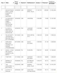 Successivamente, al sesto posto, abbiamo Ag4in – Il film del quarto scudetto del Napoli, distribuito da Filmauro. Il documentario celebra la storica vittoria conseguita da parte dei partenopei lo scorso maggio. La pellicola, rivolta principalmente a tifosi e appassionati, sta già facendo discutere online per i retroscena legati all’allenatore Antonio Conte.