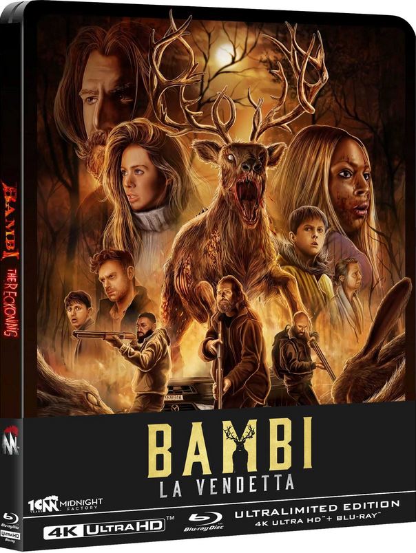 Mammifero che, concepito in CGI, ci va giù pesante utilizzando le proprie corna sia per infilzare che per tranciare in due parti le vittime predestinate. Mentre l’ambientazione boschiva notturna provvede a fornire l’indispensabile avvolgente atmosfera e, in agguato, abbiamo anche pericolose tagliole e coniglietti killer. Al servizio di una rivisitazione che, come le precedenti appartenenti al Twisted Childhood Universe, Plaion pictures rende disponibile in ultralimited edition steelbook nella sua collana Midnight Factory. Una ultralimited edition che, con booklet incluso nella confezione, dispensa Bambi – La vendetta sia in 4K Ultra HD che su supporto blu-ray. Con commento audio e trailer italiano e inglese a fare da contenuti speciali al primo disco e presenti anche nel secondo. Insieme a quasi dieci minuti di domande al cast, circa quattro di scene eliminate e ben cinquantacinque di interviste.