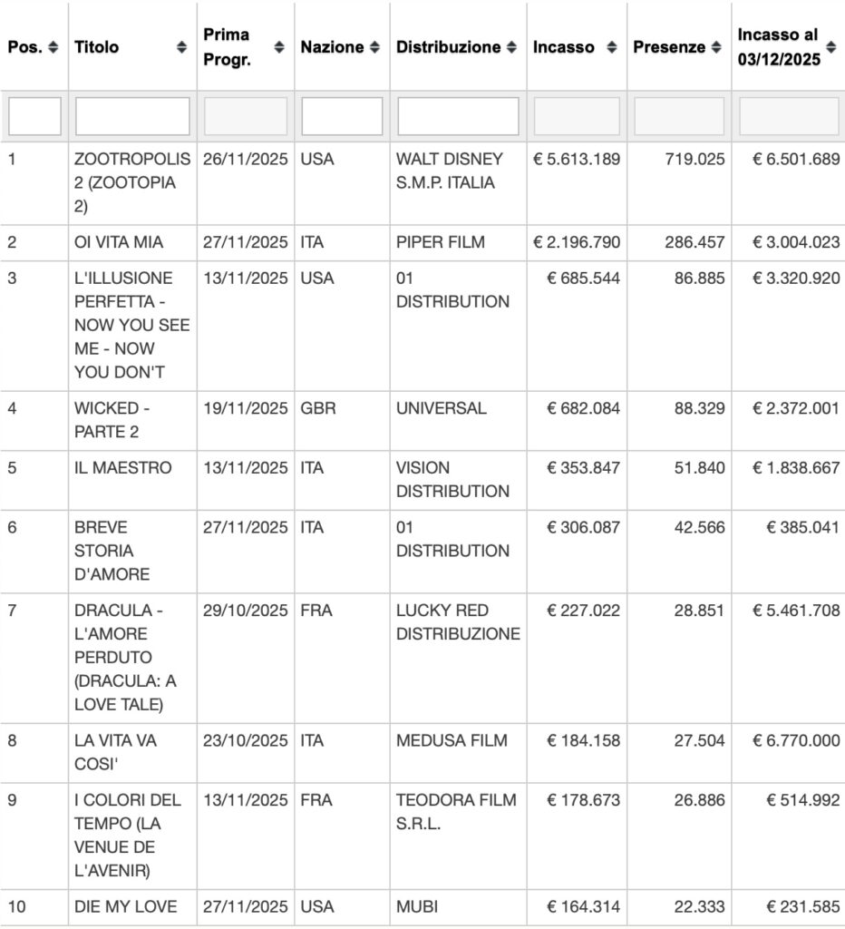 Il periodo della festività è finalmente iniziato. Ad inaugurarlo sono state le uscite di peso delle ultime settimane, avvenute in concomitanza con il weekend del Ringraziamento americano. Con l’uscita di Zootropolis 2 e Wicked: Parte 2, prende il via la corsa che ci accompagnerà al box office per tutta la stagione natalizia. Il cambio di rotta rispetto alla scorsa settimana è netto: ben cinque titoli su dieci abbandonano la classifica, lasciando spazio alle nuove uscite. Ad abbandonare la top ten italiana troviamo: 40 Secondi, Cinque Secondi, Shelby Oaks – Il covo del male, insieme al già discusso flop The Smashing Machine e al vincitore della Palma d’Oro al Festival di Cannes, Un semplice incidente (A simple accident).