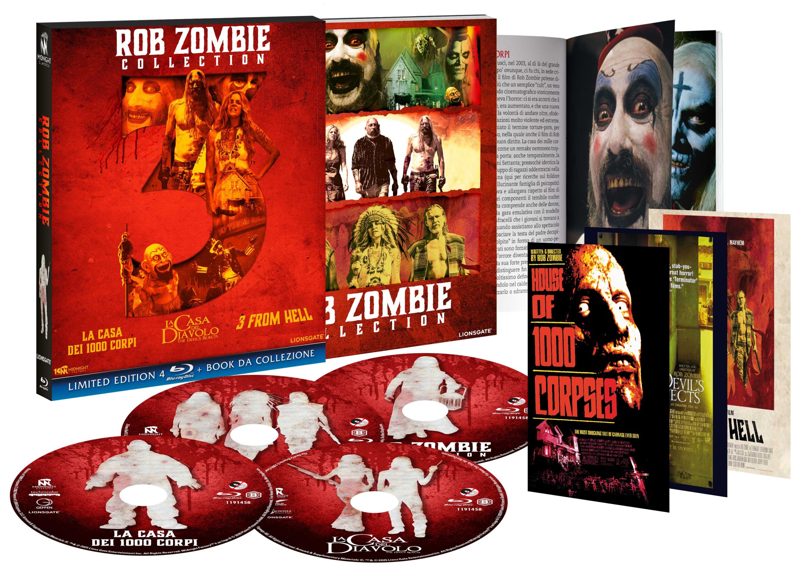 Rob Zombie collection è il prestigioso cofanetto che va ad aggiungersi alla sempre più ricca collana Midnight Classics di Plaion pictures. Un prestigioso cofanetto cartonato a tiratura limitata di mille copie contenente ben quattro blu-ray per celebrare tre fondamentali titoli della filmografia di Rob Zombie. Il rocker che, all’anagrafe Robert Cummings, a partire da inizio terzo millennio si è trasformato in regista di culto per i fan dell’horror. Soprattutto grazie alla trilogia dedicata alla sanguinosa combriccola dei Firefly, costituita da La casa dei 1000 corpi, La casa del diavolo e 3 from hell. Trilogia che troviamo, appunto, all’interno di questa edizione home video in alta definizione, accompagnata da un booklet e da tre card da collezione. Ciascun disco con relativi contenuti speciali, più un quarto supporto interamente dedicato a materiale extra diviso in sezioni relative ad ognuno dei film. Supporto, dunque, che per La casa dei 1000 corpi offre cinque dietro le quinte, undici interviste, il test del Dottor Satana e quello del Professore. Più sette minuti di prove del cast e quattro di provino di Dennis Fimple, che veste i panni di nonno Hugo. È invece il ricchissimo making of di oltre due ore e venti minuti ad occupare la sezione riguardante La casa del diavolo. Come pure ricchissimo è il making of di un’ora e trentaquattro minuti di 3 from hell.