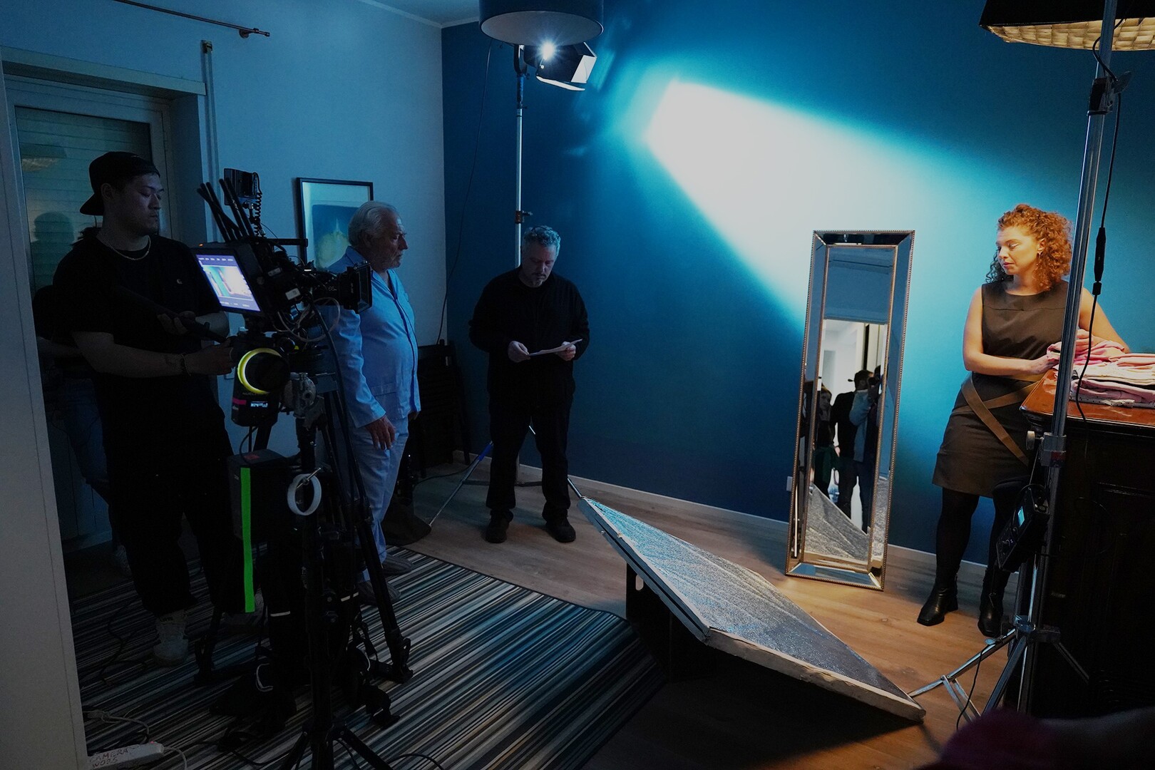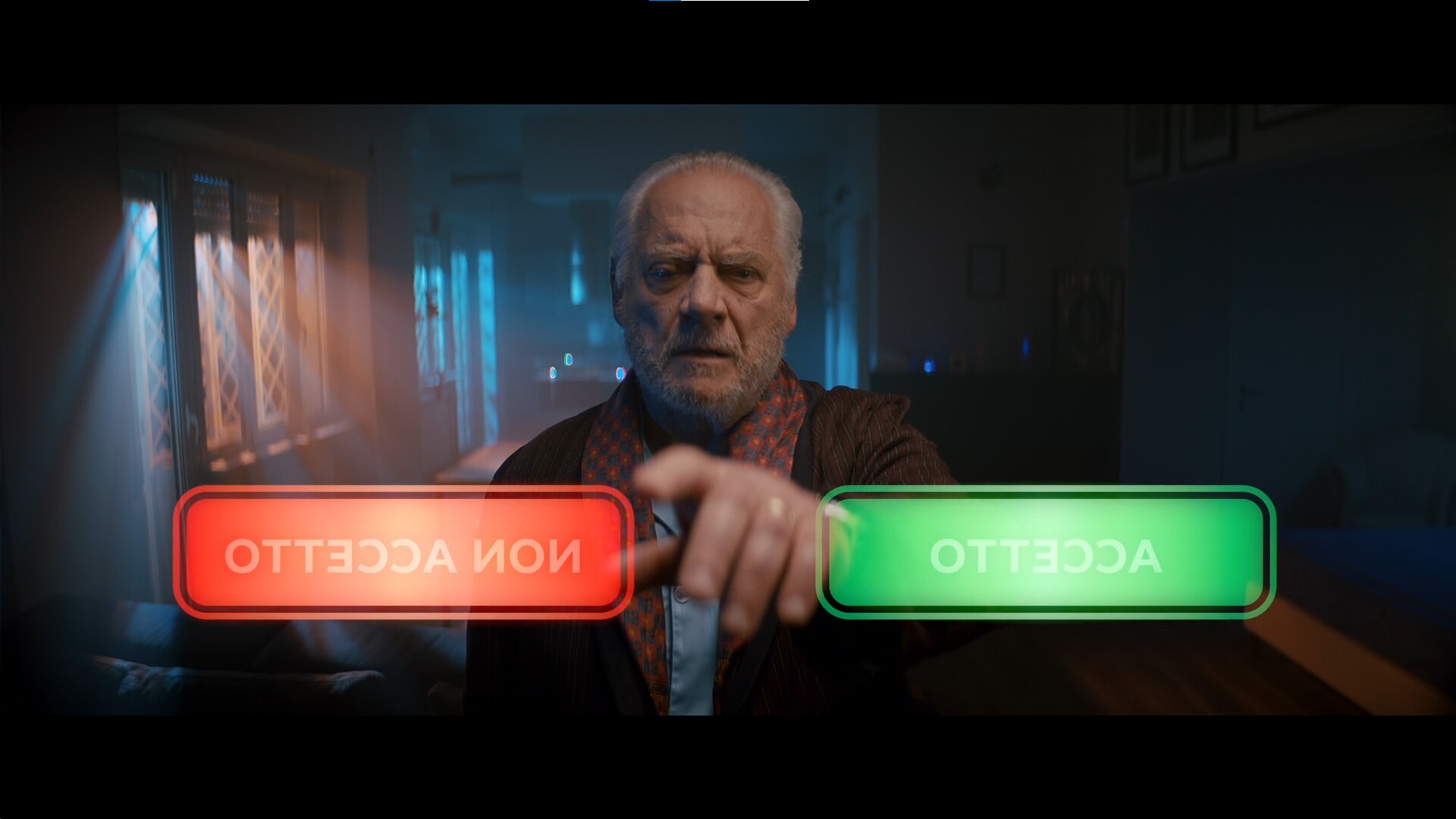 Tendiamo ad essere abituati a vedere i giovani che si agitano per un commento di troppo. A preferire vivere attraverso gli archivi digitali, utilizzando come passatempo i videogiochi. In Candido tutto si ribalta: ci troviamo nel 2049, con un protagonista ormai anziano che deve aspettare gli ottanta anni per andare in pensione. Dimora in una casa ipertecnologica e ordinata, dove qualsiasi cosa necessita di un posto ben preciso, persino lo stesso bicchiere d’acqua sulla scrivania. Anche la fotografia di Gianluca Mastronardi accompagna questa sensazione di controllo: quando lo spazio si allontana dalla natura, l’immagine si raffredda, virando su tonalità bluastre e artificiali. È come se l’ambiente domestico fosse già un’estensione dell’aldilà digitale, un luogo sospeso dove il calore umano fatica a trovare spazio.